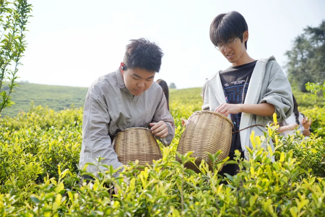 走进茶山,采茶、品茶,师生在课外提升文化修养和劳动实践能力。(后勤服务中心 安吉校区后勤事务中心)