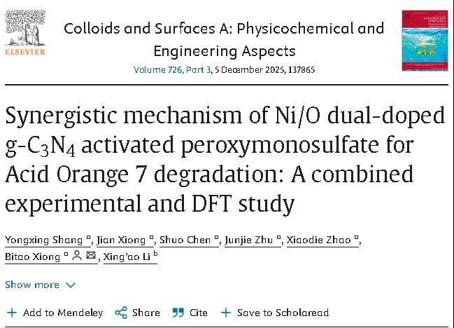 近日,应用物理2022级本科生商永兴以第一作者身份在《Colloids and Surfaces A: Physicochemical and Engineering Aspects》期刊上发表了题为“Synergistic mechanism of Ni/O dual-doped g-C3N4 activated peroxymonosulfate for Acid Orange 7 degradation: A combined experimental and DFT study”(阅读原文)的文章。米乐mile体育官网为第一署名单位,应用物理系熊必涛老师为论文通讯作者。