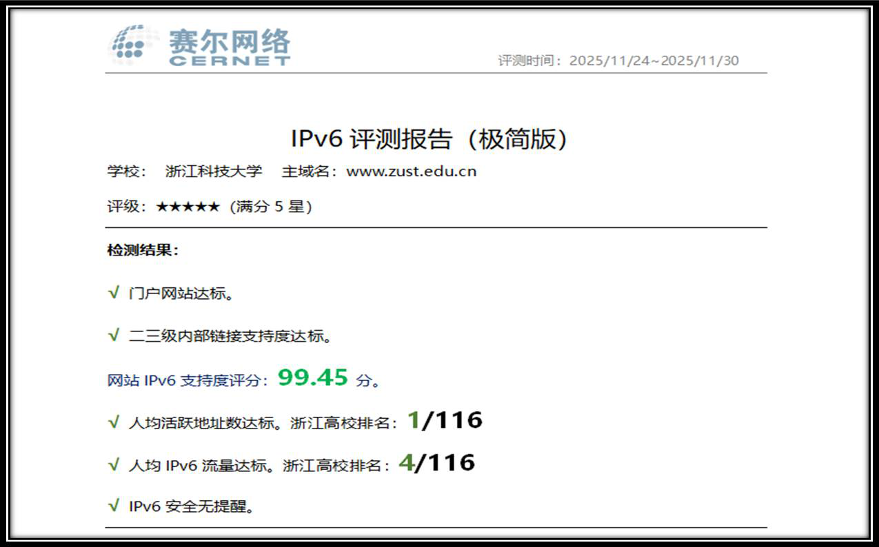 据悉,IPv6作为下一代互联网核心基石,正引领网络空间深刻变革,为深入贯彻落实教育部《推进互联网协议第六版(IPv6)规模部署行动计划》和《浙江省深入推进IPv6规模部署和应用2025年工作要点》工作要求,今年暑期以来,学校加强顶层设计,积极推进两校区网络整体升级优化与应用改造。目前,校园网及数据中心已全面实现IPv4/IPv6双栈覆盖,学校门户网站及各层级子链接均支持IPv6访问,整体运行安全稳定。