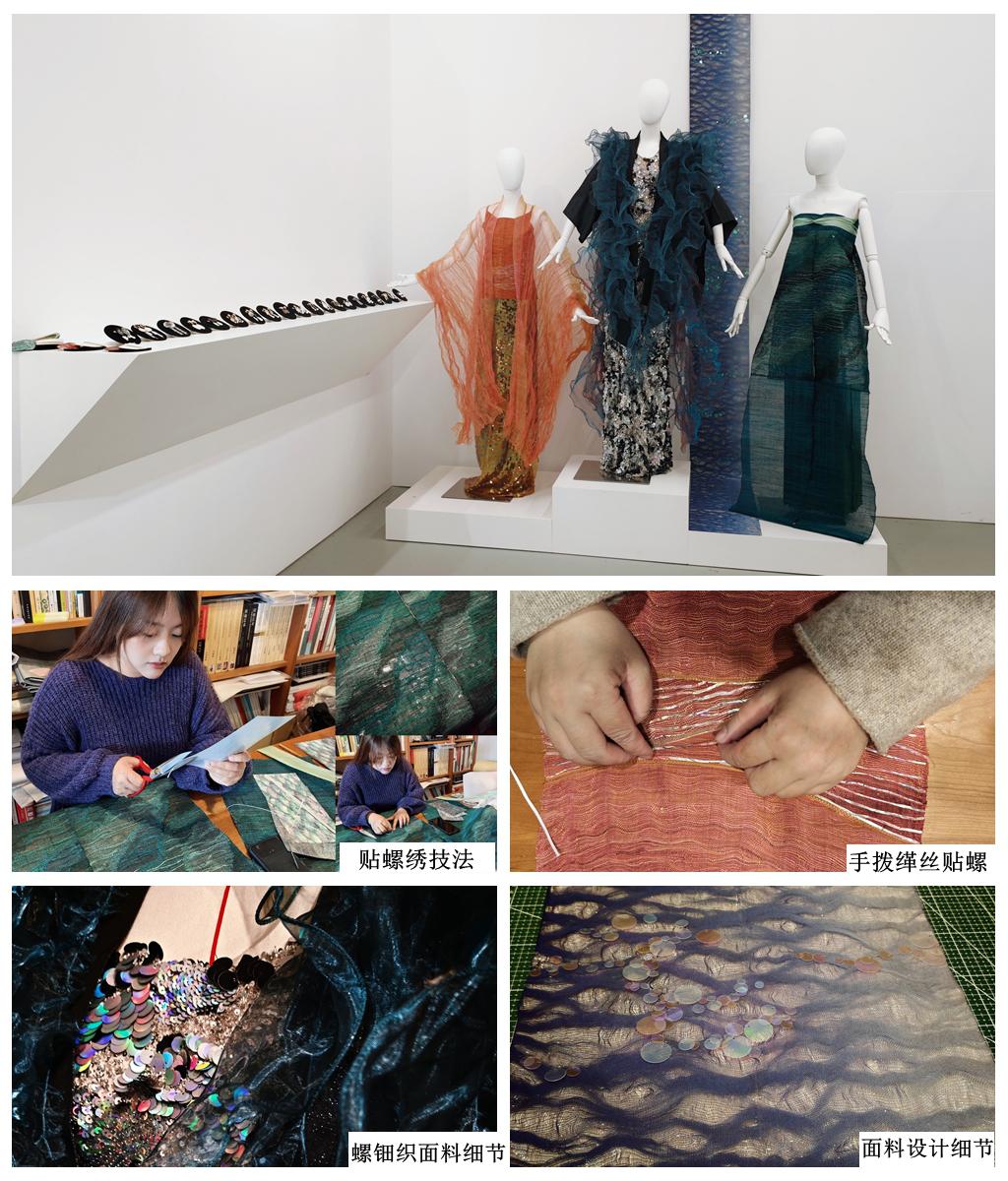 服装服饰系列设计作品《月升沧溟》立足中国传统服饰结构精髓与色彩体系,以求“解构”之妙。从宋代褙子、抹胸、霞帔的清雅线条中提取原型,以现代生活审美重塑“宋韵中装廓形”,在直线裁剪中融入装饰嵌片和立裁结构。既保留东方平面剪裁的流畅,又顺应人体动态形成自然的立体空间,让衣衫在行走间如海波般有呼吸感 。色彩上,以海天月辉为取色情境,以中国传统色为基调,提取“月白”“沧浪”“碧波”“映月”为底色意象,辅以“朱砂红”“螺钿紫”点睛,既可见海天澄澈,又喻月夜皎静。以手工再造螺钿复合面料与幻彩纱、手拨缂丝、螺钿织绣技法,营造月升沧溟时刻的浮光跃金。该系列服饰品设计作品主要是耳夹,综合运用激光雕刻技术在天然贝壳上刻画海浪、行船、船舵、风帆等航海主题纹饰,以天然珍珠作为点缀装饰。整体风格现代简约中透出精致生活审美,产品获得了现场观众的广泛好评。该作品紧密拥抱海丝文明精神,将历史及文化转化为具有当代审美与文化自信的作品,把“传统底蕴”和“现代表达”紧密连接。设计灵感源于对海上丝绸之路月夜航行意象的诗意捕捉,经由中国传统服饰语言重构,化作一场关于“千山万水共一轮明月”的视觉文化叙事。
